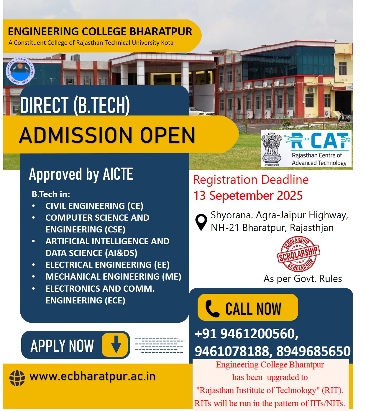 At the serene outskirts of the city Bharatpur, EC Bharatpur is located in The Golden Triangle (Tourist circuit which connects the national capital New Delhi, Agra and Jaipur) at National Highway No.-11. It was established in the year 2007. Since then it has constantly grown with very fast pace. It is the first engineering college in the Bharatpur division. The campus is spread over an area of 40 acres. It offers students a peaceful atmosphere.